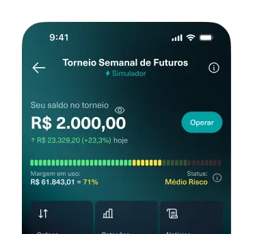 Você opera com R$ 2.000 fictícios, em um ambiente que simula o mercado real. Ativos disponíveis: Futuros de Mini Índice (WIN) e Mini Dólar (WDO). Tudo direto pelo app.